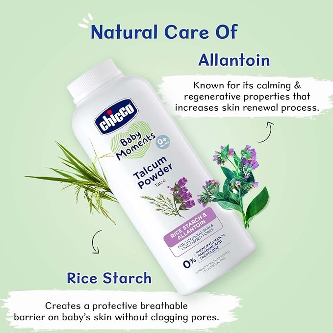 Chicco Baby Moments Talcum Powder (150 gm) is specially formulated to keep your baby’s delicate skin soft, dry, and fresh. Enriched with gentle ingredients, it helps prevent rashes and irritation, leaving your baby comfortable all day. Perfect for daily use on all skin types, including sensitive skin.